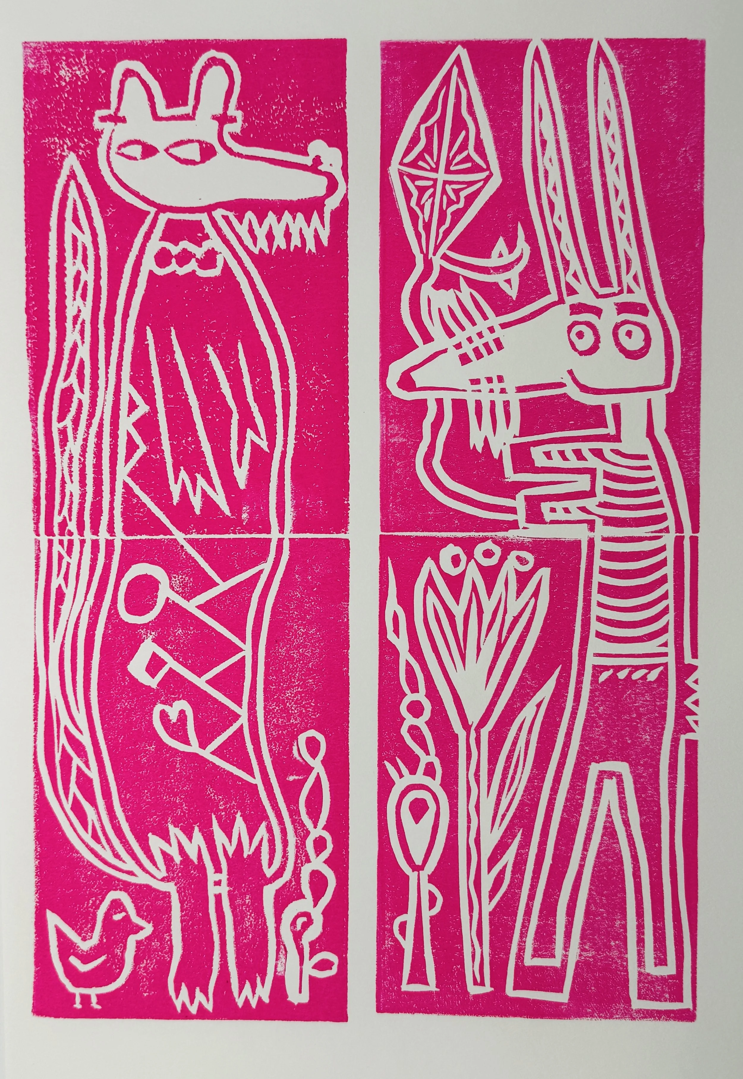 Characters, flora, and shapes on paper and fabric.